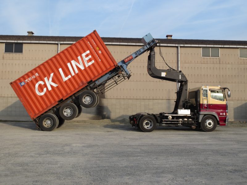 海上コンテナ用のダンプヘッドです。水島港コンテナ基地では珍しいヘッドです。鉄の原料を船ではなくコンテナで輸送しそのままダンプアップして納品します。